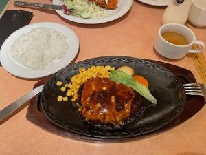 熱々の鉄板ハンバーグ。これで気合を入れました!