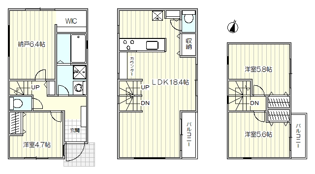 間取詳細 | (1F)洋4.7、(1F)S6.4、(2F)LDK18.4、(3F)洋5.6、(3F)洋5.8 |